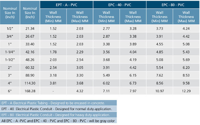 Material: The material for electrical plastic conduit pipes, according to the NEMA standard, is made from rigid Polyvinyl Chloride (PVC). The plastic compound used in manufacturing adheres to ASTM D 1784, and the color is gray.
